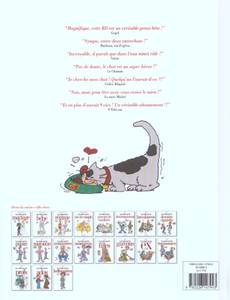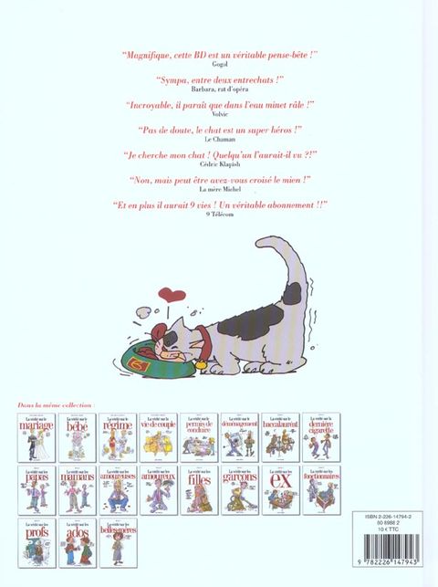 " magnifique, cette bd est un véritable pense-bête ! " gogol. " sympa, entre deux entrechat ! " barbara, rat d'opéra. " incroyable, il paraît que dans l'eau minet râle ! " volvic. " pas de doute, le chat est un super héros ! " le chaman. " je cherche mon chat ! quelqu'un l'aurait-il vu ?§ " cédric klapish. " non, mais peut être avez-vous croisé le mien ! " la mère michel. " et en plus il aurait 9 vies ! un véritables abonnement !! " 9 télécom.