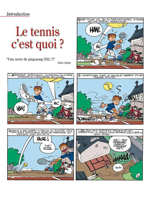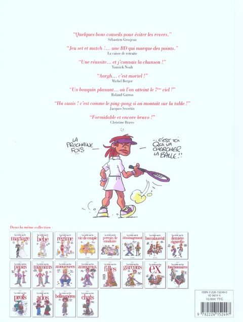 " quelques bons conseils pour éviter les revers " sébastien grosjean. " jeu set et match !. une bd qui marque des points. " la caisse de retraite. " une réussite. et j'connais la chanson ! " yannick noah. " aargh. c'est mortel ! " michel berger. " un bouquin planant. oú l'on atteint le 7e ciel ! " roland garros. " ha ouais ! c'est comme le ping-pong si on montait sur la table ! " jacques secrétin. " formidable et encore bravo ! " christine bravo.