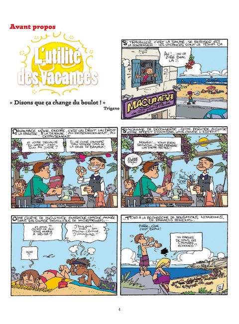 Les vacances, c'est la détente, le dépaysement, la mer ou la montagne, les rencontres, le soleil. Enfin, en théorie ! Car on voudrait le nier, mais c'est aussi les embouteillages pires que sur le périph', les plages bondées comme le métro, l'angoisse de ne pas profiter des quelques jours octroyés, des arnaques à gogo, des coups de soleil et parfois des coeurs brisés ! Un guide de Monsieur B. (qui n'a pas chômé !) à emporter dans son sac de plage, pour rire de ce qui tourne parfois mal pendant les congés, et pour ne pas oublier de se recentrer sur le principal : les vacances, c'est surtout le moment où l'on a le droit de ne rien faire.