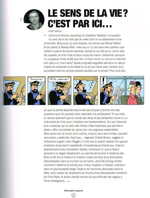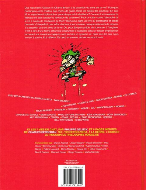 Voici la version "beau livre" du hors-série de Philosophie magazine, qui s'est vendu à l'été 2012 à 40.000 exemplaires en kiosque ; c'est un peu la suite de Tintin au pays des philosophes, album vendu à 36.000 exemplaires en 2011. Avec deux bonus inédits (16 pages) : les 7 vies du Chat par Philip Geluck et 6 planches originales de Charles Berberian. Richement illustré et contenant des planches originales (Trondheim, Jul, Aurélia Aurita...) aussi bien que des grands classiques : Gaston, Charlie Brown, Astérix, Crumb... En regard des planches, philosophes et spécialistes de BD méditent sur l'absurde, l'héroïsme, le destin. Il en ressort une leçon de philosophie joyeuse et profonde. L'ouvrage intéressera tous les passionnés de BD et de philosophie, mais c'est aussi un cadeau idéal pour les fêtes de fin d'année. Album dirigé par Sven Ortoli. Articles et interviews de Umberto Eco, Tristan Garcia, Clément Rosset, Pascal Ory, Martin Winckler, Boris Cyrulnik, Frédéric Worms, Pascal Bruckner, Serge Tisseron... Planches originales de Lewis Trondheim, Jul, Marc-Antoine Mathieu et Aurélia Aurita.