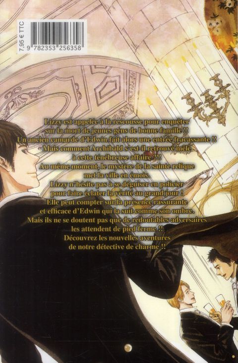 Lizzy est appelée à la rescousse pour enquêter sur la mort de jeunes gens de bonne famille !! Un ancien camarde d'Edwin fait alors une entrée fracassante !! Mais comment Archibald s'est-il retrouvé mêlé à cette ténébreuse affaire ?!! Au même moment, le mystère de la sainte relique met la ville en émois. Lizzy n'hésite pas à se déguiser en policier pour faire éclater la vérité au grand jour ! Elle peut compter sur la présence rassurante et efficace d'Edwin qui la suit comme son ombre. Mais ils ne se doutent pas que de redoutables adversaires les attendent de pied ferme !! Découvrez les nouvelles aventures de notre détective de charme !!