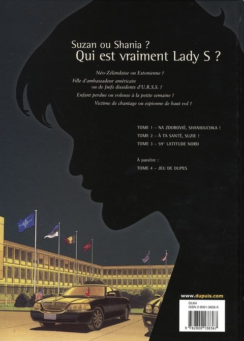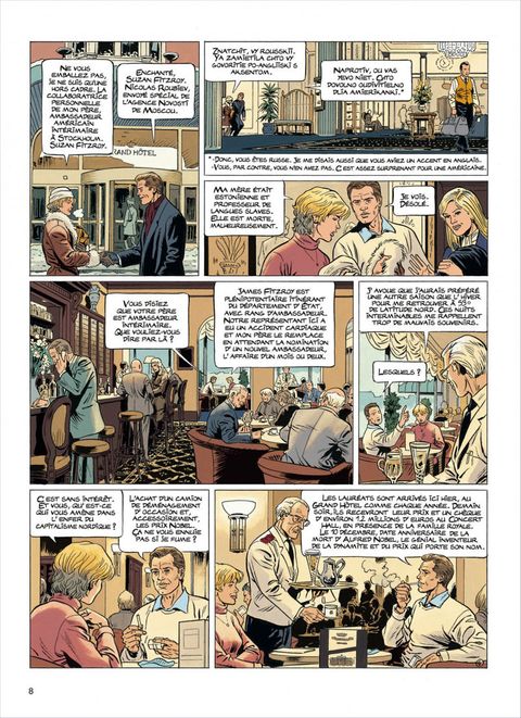 Un passé de plus en plus lourd à porter... C'est l'hiver à Stockholm. Suzan y séjourne avec son père adoptif, ambassadeur itinérant en mission de remplacement de quelques semaines dans la capitale suédoise. Suzan y trouve le temps long ; mise à part la toute prochaine cérémonie des Nobel, les distractions y sont inexistantes et les nuits interminables. Mais très vite, de vieilles connaissances viennent se rappeler à son (mauvais) souvenir. Orion d'abord, représentant d'une mystérieuse agence de lutte contre le terrorisme. Anton Grivenko ensuite, celui-là même qui avait été son compagnon de larcins dans un passé encore brûlant. Orion "impose" aux deux jeunes gens une mission qui consiste à dérober dans la chambre d'un richissime pakistanais des documents qui permettraient de le compromettre. L'opération est menée à bien - non sans mal - et s'avère pour le moins fructueuse : les documents mettent à jour un plan totalement ahurissant d'enlèvement des prix Nobel !... Il existe plusieurs éditions avec même ISBN/EAN. L'EO est DL 10/2006 avec ISBN 2-8001-3836-X