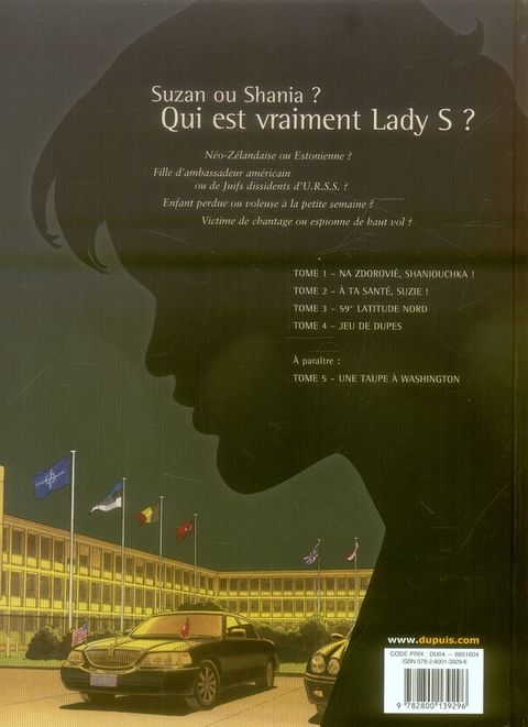 Les Américains s'étant donné pour mission de protéger le monde libre, ils entendent tout savoir sur tout. Aussi la C.I.A. est-elle colère de ne pas en savoir davantage sur le C.I.R.C.A.T., un centre européen qui tenterait de déjouer les menaces terroristes sur le Vieux Continent. Croyant savoir que Lady S est une recrue occasionnelle du mystérieux centre, la C.I.A. décide de faire enlever son père adoptif, dans l'espoir que la jeune héroïne appelle le C.I.R.C.A.T. à son secours et partant, permette l'identification de certains de ses agents. Et voilà Suzan embringuée contre son gré dans une nouvelle aventure, dans un road movie survitaminé à travers la France... Le puzzle se reconstruit... Dans les premiers tomes de "Lady S", la dernière-née des séries de Jean Van Hamme, l'auteur a pris un malin plaisir à jeter en l'air les pièces d'un puzzle et à les laisser retomber au gré de sa fantaisie. Avec Jeu de dupes, tome 4 de la série, le puzzle commence à se reconstruire. Ainsi, par exemple, en apprend-on un peu plus sur le passé tourmenté de Suzan. Ainsi également la jeune femme met-elle enfin des noms et des visages sur ceux qui la manipulent depuis trop longtemps. Sans doute viendra l'heure où Suzan pourra décider de son présent et de son avenir sans que son passé ne lui revienne à la figure... Il existe plusieurs éditions avec même ISBN/EAN. L'EO est DL 10/2007 avec EAN 978-2-8001-3929-6