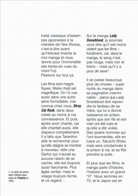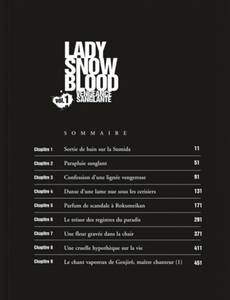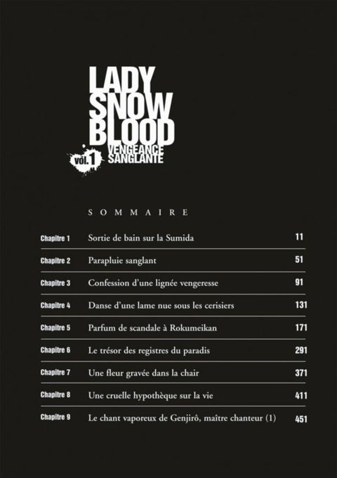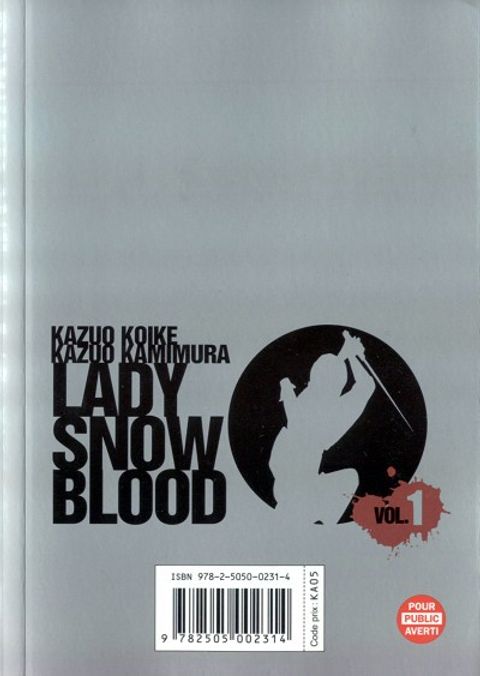 Sayo, condamnée à la prison à vie, pour avoir tué l'assassin de son mari et de son fils, ne vit plus que pour une chose : donner naissance à l'instrument de sa vengeance. Elle décède malheureusement en couches en donnant le jour à une fille, Yuki, qui, suivant sa destinée, deviendra la redoutable Lady Snowblood, aux charmes aussi affûtés que le sabre ! Le manga culte qui a inspiré "Kill Bill" !