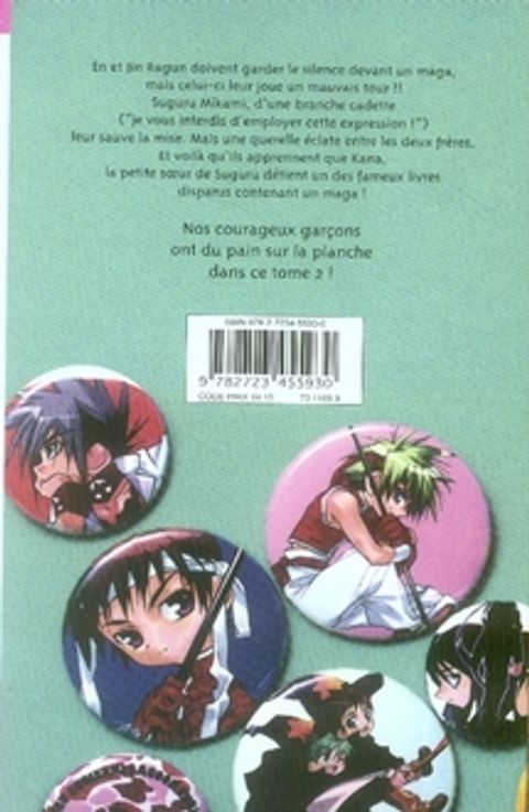 en et lin ragun doivent garder le silence devant un maga, mais celui-ci leur joue un mauvais tour !! suguru mikami, d'une branche cadette (""je vous interdis d'employer cette expression !"") leur sauve la mise. mais une querelle éclate entre les deux frères. et voilà qu'ils apprennent que kana, la petite soeur de suguru détient un des fameux livres disparus contenant un maga. nos courageux garçons ont du pain sur la planche dans ce tome 2 !
