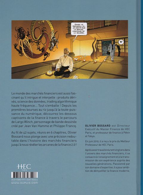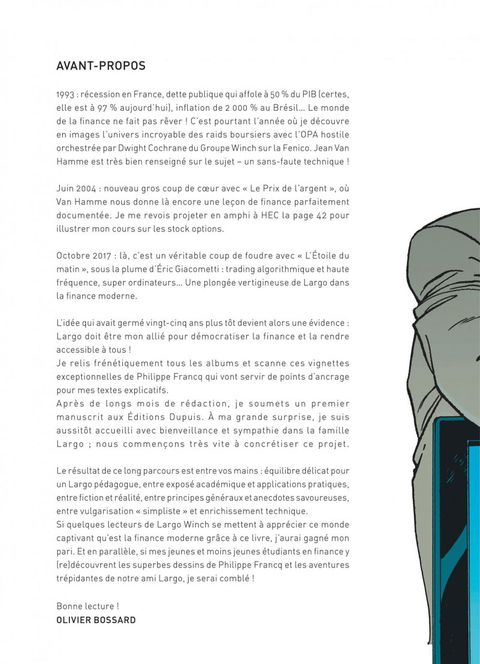 Qui de mieux placé que Largo Winch pour expliquer les arcanes de la finance 2.0 ? Notre milliardaire humaniste se fait pédagogue et permet de mieux comprendre les marchés financiers, disruptés par les produits dérivés et la science des données. Les nouveaux ennemis qu'affronte Largo dans "L'Étoile du Matin" et "Les Voiles écarlates" sont bel et bien le trading algorithmique et le trading haute-fréquence. Des notions que ce titre permet de mieux appréhender ! Mais au-delà du dernier diptyque de Largo Winch, c'est l'ensemble des aventures de Largo que l'auteur nous invite à revisiter, sous l'angle thématique de la finance. Une plongée abyssale dans les arcanes de la finance, qui nous fait redécouvrir avec une précision redoutable les mécanismes sous-jacents aux différentes aventures de Largo ! Olivier Bossard, professeur de finance à HEC Paris, à Pékin et à Tokyo, nous fait découvrir la finance moderne, ses aspects les plus méconnus et ses côtés les plus captivants. Un ouvrage didactique qui s'articule en 42 sujets, regroupés en 6 chapitres. Illustrés par de magnifiques vignettes de Philippe Francq, cette vulgarisation financière permet de mieux comprendre le fonctionnement de la bourse et des marchés financiers.