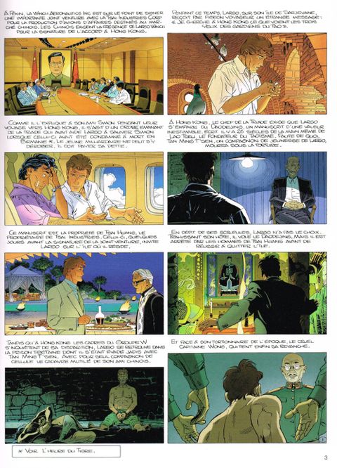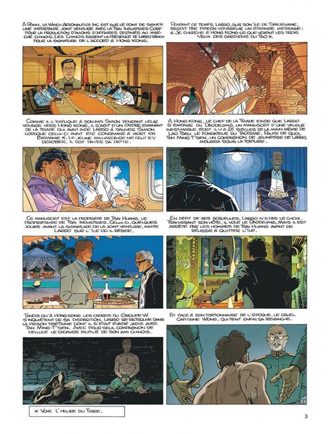 Faux-semblants Hong Kong. La division aéronautique du groupe W, représentée par André Bellecourt, conclut l'accord de joint venture avec la Tsai Industries Corp. Les Chinois avaient émis le souhait que Largo Winch en personne signe les contrats. Mais le jeune milliardaire n'ayant plus donné signe de vie depuis qu'il a quitté l'île de Tsai Huang, ils ont fait leur deuil de ce caprice. Pour les cadres du groupe W, Largo a probablement été victime d'un naufrage ou d'un enlèvement par des pirates. Pour son fidèle ami Simon, dont l'instinct de truand lui ment rarement, ça sent le coup fourré. Pour M. Tsai Huang enfin, la question ne se pose même pas : il sait pertinemment que Largo Winch croupit dans une de ses prisons...