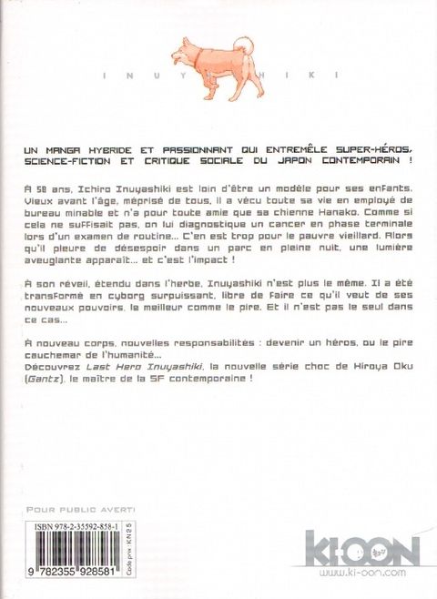À 58 ans, Ichiro Inuyashiki est loin d’être un modèle pour ses enfants. Vieux avant l’âge, méprisé de tous, il a vécu toute sa vie en employé de bureau minable et n’a pour toute amie que sa chienne Hanako. Comme si cela ne suffisait pas, on lui diagnostique un cancer en phase terminale lors d’un examen de routine… C’en est trop pour le pauvre vieillard. Alors qu’il pleure de désespoir dans un parc en pleine nuit, une lumière aveuglante apparaît… et c’est l’impact ! À son réveil, étendu dans l’herbe, Inuyashiki n’est plus le même. Il a été transformé en cyborg surpuissant, libre de faire ce qu’il veut de ses nouveaux pouvoirs, le meilleur comme le pire. Et il n’est pas le seul dans ce cas…