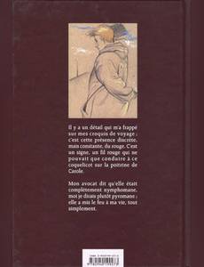 "IL y a un détail qui m'a frappé sur mes croquis de voyage ; c'est cette présence discrète, mais constance, du rouge. C'est un signe, un fil rouge. C'est un signe, un fil rouge qui ne pouvait que conduire à ce coquelicot sur la poitrine de Carole. Mon avocat dit qu'elle était complètement nymphomane, moi je dirais plutôt pyromane ; elle a mis le feu à la vie, tout simplement."