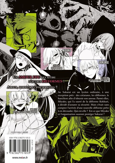 Un amour fou qui attire d'autres difformes ! Amour, horreur et psychopathes !!Ao Sakurai est un lycéen ordinaire, à une exception près : des créatures, les difformes, le harcèlent afin d'obtenir son amour. Parmi elles, Miyako, qui l'a sauvé de la difforme Kokkuri, a décidé d'assurer sa sécurité. Mais c'était sans compter l'arrivée d'une nouvelle difforme prête à en découdre. Qui est-elle ? Est-ce que Miyako et l'organisation sauront protéger Sakurai ?
