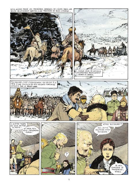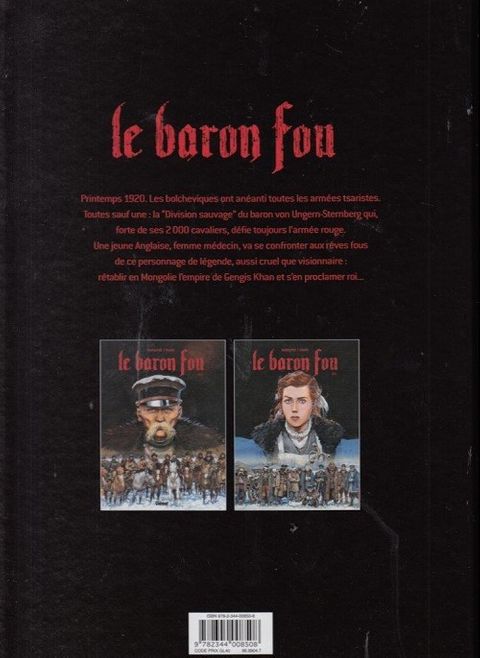 Ourga, la capitale mongole, est à présent entre les mains de la Division sauvage de Roman Von Ungern. Mais le baron ne s'en est pas sorti indemne. Blessé lors de l'attaque, il est pris en charge par Élisabeth qui, à mesure qu'elle le soigne, semble se rapprocher de son ravisseur. Un jour, en lui retirant son pansement, la jeune Anglaise découvre sous le bandage une marque en forme de pique. Élisabeth osera-t-elle lui avouer que ce symbole noir que le Baron redoute tant, c'est lui-même qui le porte dans son dos ? Seulement quelques mois après le premier tome, découvrez la fin de ce très beau diptyque empreint de romance, d'aventure et d'exotisme. Rodolphe et Michel Faure s'inspirent de l'histoire incroyable du « Baron Fou » Von Ungern, dernier général tsariste autoproclamé successeur de Gengis Khan, qui envahit la Mongolie à la fin de la Première Guerre mondiale.