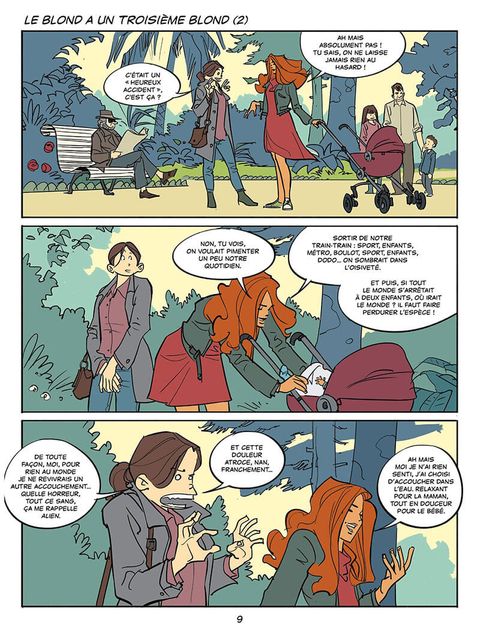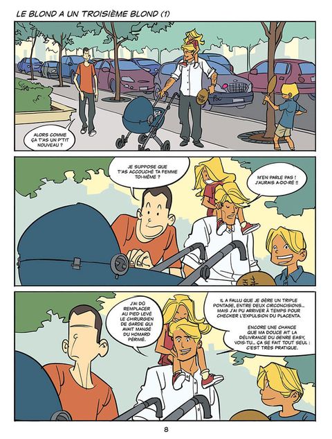Dans ce tome 2, le Blond ne cesse de nous surprendre : il a un troisième Blond (easy, évidemment, ça ne change rien si ce n'est une dose de bonheur supplémentaire) ; il change de boulot (oui, il excelle dans son travail de chercheur - ou plutôt de « trouveur » puisqu'il est le seul chercheur à trouver -, mais à quoi bon stagner et ne pas pimenter sa vie ?) ; il concilie à merveille vie de famille, vie sociale et vie amicale, les sorties scolaires, les activités sportives (les siennes mais aussi celles des enfants, bien entendu), sans jamais négliger sa douce qu'il aime par-dessus tout... Le Blond, quoi !!! Dans ce tome 2, le Blond et l'Autre se connaissent, se côtoient, se rendent des services, leurs enfants s'invitent à leurs goûters d'anniversaire... un peu comme dans notre vie à tous, en somme. Car oui, vous aussi, enfin nous aussi, nous avons une famille de Blonds autour de nous. Et aussi agaçants, déconcertants, exaspérants, crispants soient-ils, on n'y peut rien, ils sont attachants, les Blonds. Et ça, c'est fort. Du Blond, du vrai.