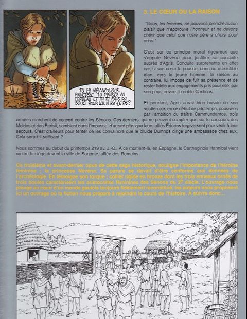 "Nous, les femmes, ne pouvons prendre aucun plaisir que n'approuve l'honneur et ne devons chérir que celui que notre père a choisi pour nous". C'est sur ce principe moral rigoureux que s'appuie Névéna pour justifier sa conduite auprès d'Agris. Conduite surprenante en effet car, si son coeur la pousse, dans un irrésistible élan, vers le jeune homme, la raison au contraire, lui impose de fuir sa présence et de rester fidèle aux engagements pris pour elle, par son père, envers le noble Casticos. Et pourtant, Agris aurait bien besoin de son soutien car, en ce début de printemps, poussées par l'ambition du traître Cammundantos, trois armées marchent de concert contre les Sénons. Ces derniers, qui ne peuvent compter que sur le concours des Meldes et des Parisii, semblent dans l'impasse, d'autant plus que leurs alliés Éduens tergiversent pour venir à leur secours. C'est d'ailleurs pour tenter de les convaincre que le druide Dumnos dirige une ambassade chez eux. Cela sera-t-il suffisant ? Nous sommes au début du printemps 219 av. J.-C.. À ce moment-là, en Espagne, le Carthaginois Hannibal vient mettre le siège devant la ville de Sagonte, alliée des Romains.