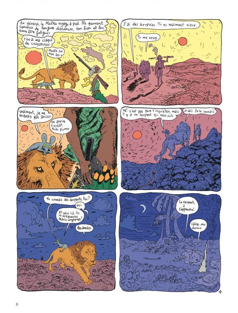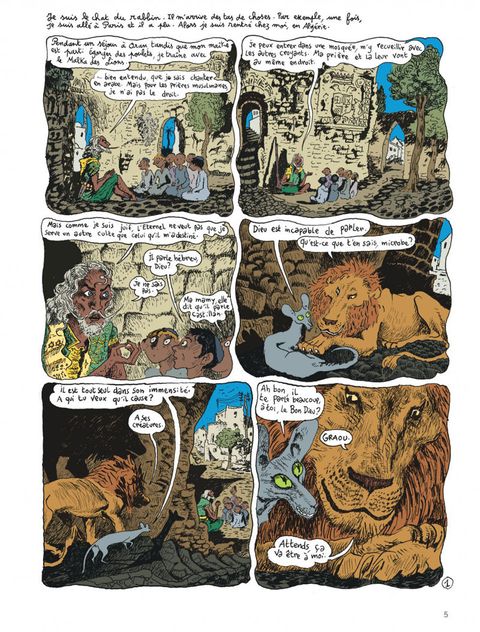 Nous avions quitté le chat perplexe, à Paris, sous la pluie. Le voici de retour en Algérie, aux alentours d'Oran plus précisément. Là, il va passer quelques jours avec le Malka des lions, véritable légende vivante, mais légende qui vieillit et s'interroge sur le sens de la vie. Savoureuse aventure philosophique, brillante digression théologique, ce quatrième tome du Chat du Rabbin est une pure merveille qui confirme le statut particulier de l'une des oeuvres majeures de la Bande Dessinée contemporaine.