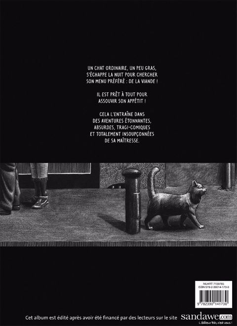 Un chat ordinaire, un peu gras, s'échappe la nuit pour chercher son menu préféré : de la viande. Il déteste les croquettes, qui sont son ordinaire à la maison. Il est prêt à tout pour assouvir son appétit. Cela l'entraîne dans des aventures étonnantes, absurdes, tragicomiques et totalement insoupçonnées de sa propriétaire.