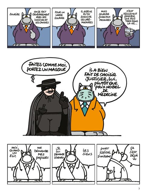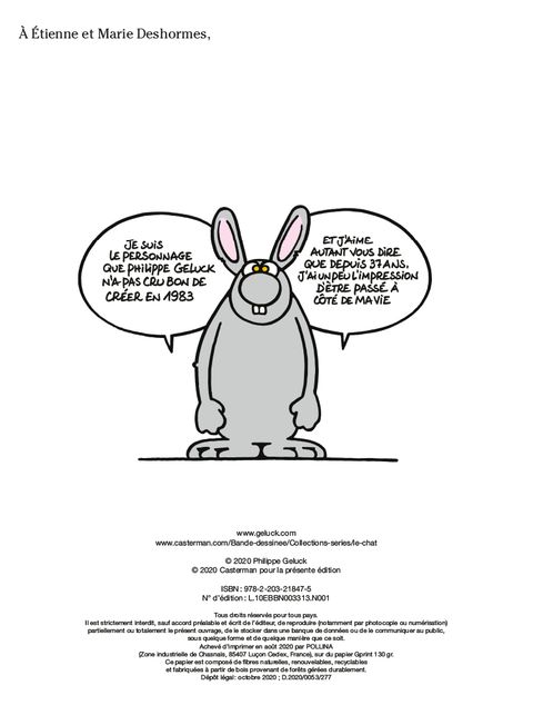 Sans pandémie, il n'y aurait pas eu de confinement, et sans confinement, il n'y aurait pas eu cet album qui arrive comme l'enfant qu'on n'attendait pas, comme la surprise joyeuse de cette fin d'année calamiteuse ! On s'explique : Philippe Geluck devait présenter en avril son exposition de sculptures monumentales sur les Champs-Elysées, mais l'expo et son catalogue ont été reportés à 2021. Sachant qu'il ne pouvait abandonner ni ses lecteurs ni son éditeur ni les libraires, l'artiste a mis à profit son enfermement pour concocter un nouveau Chat qui regorge de gags hilarants, de gravures détournées et de dessins politiquement très incorrects. Alors, merci qui ? Merci le coronavirus !