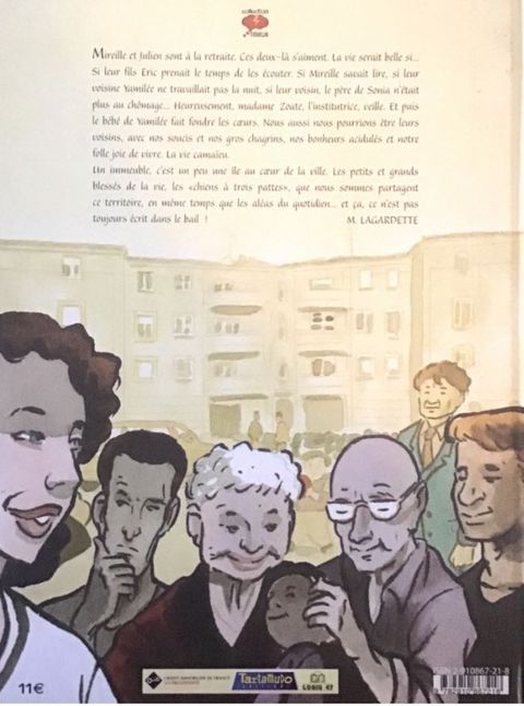 Mireille et Julien sont à la retraite. Ces deux-là s'aiment. La vie serait belle si. Si leur fils Eric prenait le temps de les écouter. Si Mireille savait lire, si leur voisine Yamilée ne travaillait pas la nuit, si leur voisin, le père de Sonia n'était plus au chômage. Heureusement, madame Zoate, l'institutrice veille. Et puis le bébé de Yamilée fait fondre tout le mond. Nous aussi nous pourrions être leurs voisins, avec nos soucis et nos gros chagrins, nos bonheurs acidulés et notre folle joie de vivre. La vie camieu. Un immeuble, c'est un peu une île au centre de la ville. Les petits et grands blessés de la vie, les "chiens à trois pattes" que nous sommes partagent ce territoire, en même temps que les aléas du quotidien, et ça ce n'est pas toujours écrit dans le bail !