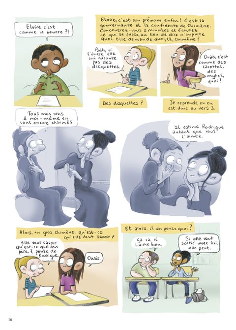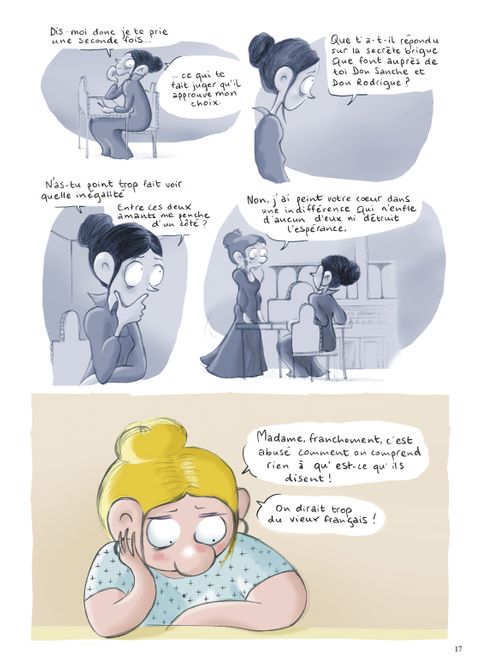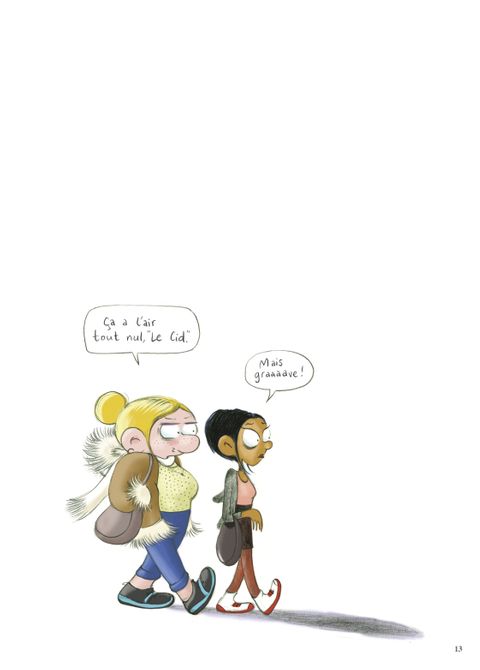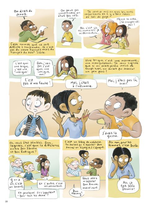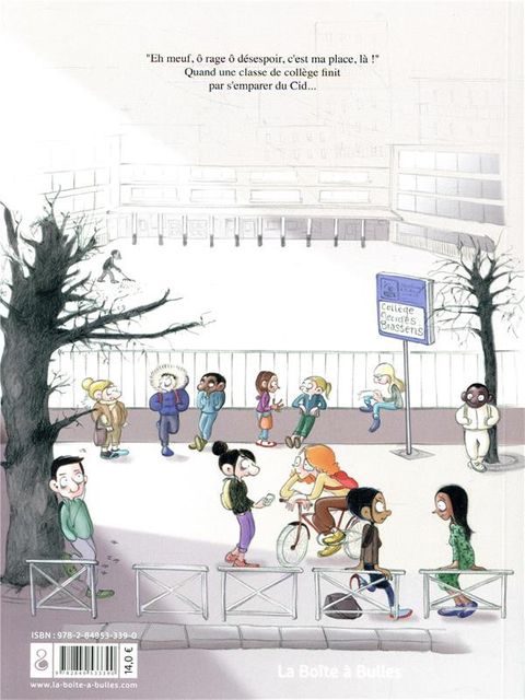 "Eh meuf, ô rage ô désespoir, c'est ma place là !" Quand une classe de collège finit par s'emparer du Cid... De nos jours, pas évident de lire Le Cid, quand on a treize ans ! Et pourtant, malgré les 382 ans qui les séparent, Chimène, Rodrigue et Don Diègue ne sont pas si éloignés de Naomy, Sarah-Lou, Brandon, Amine et de leurs acolytes ! Bienvenue dans le huis-clos de la salle de classe de 4e B. Entre frictions, moments de grâce, inepties et traits d'esprit, les élèves vont peu à peu apprivoiser la pièce et son langage suranné, à l'image de Lou qui s'exclame désormais "M'dame, quel outrage infâme, on m'a pris mon quatre couleurs !" L'auteure, enseignante de Français au collège, livre ici le récit d'un apprentissage ardu mais non sans piquant, où les plus classiques ne sont pas forcément ceux que l'on croit ! Une bande dessinée tout public, plein d'humour et d'enseignements