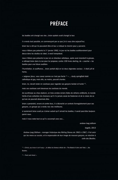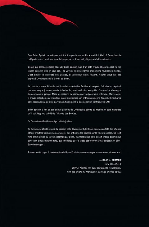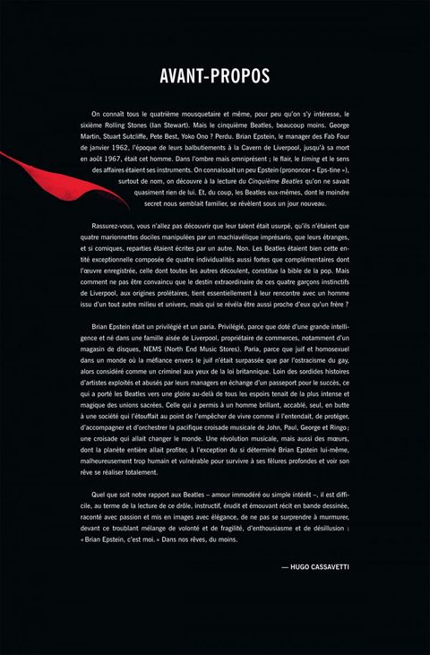 Le Cinquième Beatles raconte pour la première fois en bande dessinée l'histoire de Brian Epstein, ce brillant visionnaire qui découvrit les Beatles dans une cave de Liverpool et les mena au sommet. Scénarisé par Vivek J.Tiwary - producteur de vidéoclips, notamment pour Bruce Springsteen et Oasis, mais aussi de spectacles à Broadway -, cet album est magnifiquement illustré par Andrew Robinson, avec la participation de Kyle Baker. Sir Paul McCartney a loué l'exactitude historique de l'ouvrage. Sa traduction en français est l’œuvre d'Hugo Cassavetti, l'un des meilleurs spécialistes français de la pop. Le livre cadeau par excellence pour tous les fans des Quatre de Liverpool.