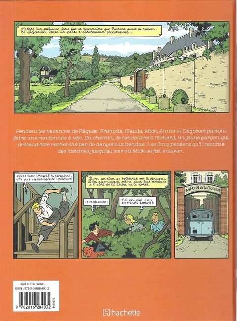 Pendant les vacances de Pâques, François, Claude, Mick, Annie et Dagobert partent faire une randonnée à vélo. En chemin, ils rencontrent Richard, un jeune garçon qui prétend être recherché par de dangereux bandits. Les Cinq pensent qu'il raconte des histoires, jusqu'au soir où Mick se fait enlever !