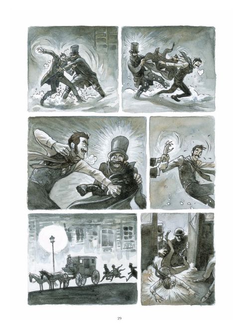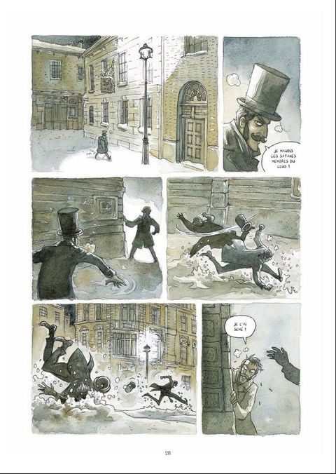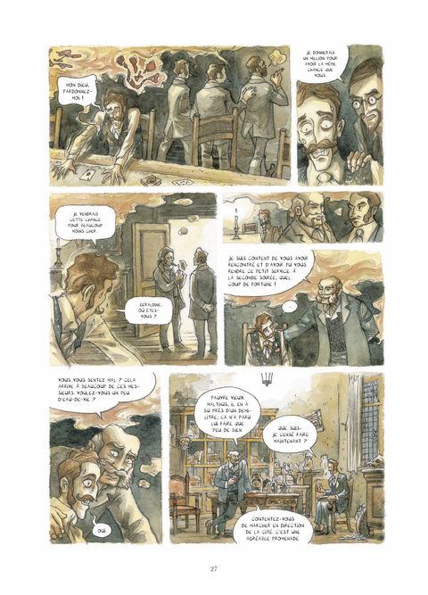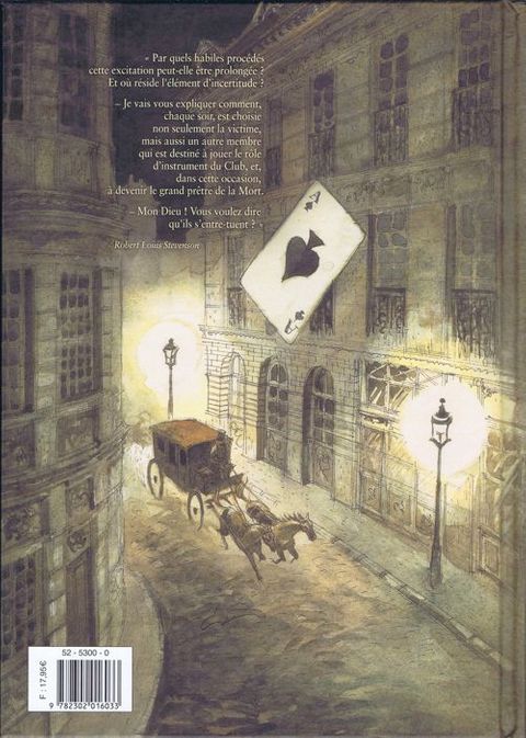 Toujours en quête d'aventures extravagantes, le prince Florizel et son acolyte, le colonel Géraldine, font un soir la rencontre d'un étrange jeune homme, qui les convie à participer à une soirée au Club du suicide. Ils découvrent alors avec horreur et fascination une partie de cartes diabolique où le seul gain est. la mort. Originellement écrit en roman-feuilleton, ce recueil de nouvelles a conservé une force brut regorgeant de digressions, d'ellipses et de changements d'atmosphères qui a permis aux auteurs d'interpréter et d'imaginer des scènes entières, tout en restant le plus fi dèle possible à R. L. Stevenson. Une réfl exion teintée d'humour noir portée par la force visuelle et le symbolisme du récit.