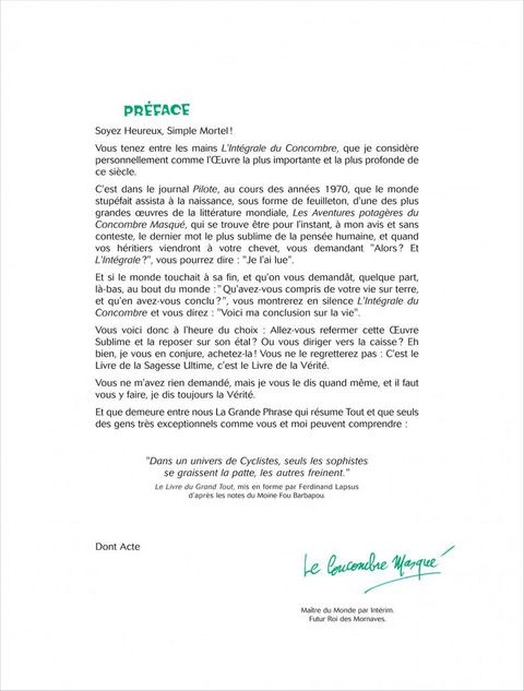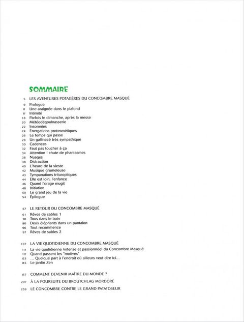 Autour et dans le cactus blockhaus dressé au milieu du désert, s'agitent des personnages récurrents, Chourave, fidèle copain, un soleil à gros nez, des éléphants ou un réveil souvent tabassé. Après Les aventures potagères du Concombre Masqué, ce sera Le retour du concombre masqué avec Archimède qui habite le cerveau du légume. Celui-ci démasqué et vieilli racontera Comment devenir maître du monde avant d'être chef de gare dans La vie quotidienne du Concombre Masqué guettant le passage de baleines des sables. Une carte au trésor laissée par son aïeul l'amènera À la poursuite du Broutchlague Mordoré génie sorti d'une lampe à souder. Il luttera contre un cinglé transformant ses adversaires en patates et le vaincra dans le Concombre contre le Grand Patatoseur .