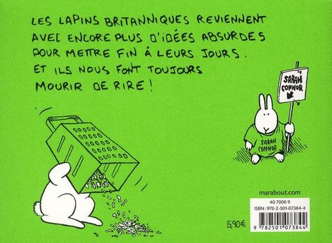 Les lapins britanniques reviennent avec encore plus d'idées absurdes pour mettre fin à leurs jours et ils nous font toujours mourir de rire ! Il s'agit du deuxième tome du Coup du Lapin (best seller en Angleterre, paru en 2006 chez Chiflet&Cie). Les lapins imaginés par Andy Riley usent des stratagèmes les plus fous et les plus drôles pour se suicider à chaque planche. Délicieusement british... Andy Riley est un scénariste culte anglais, dessinateur du strip hebdomadaire de The Observer Magazine. Grand amateur d'humour noir et absurde, il est scénariste de séries télévisées britanniques, entre autres l'auteur du célèbre Robbie the Reindeer, diffusé sur CBS, et de la nouvelle animation de Disney, Gnomeo and Juliet.