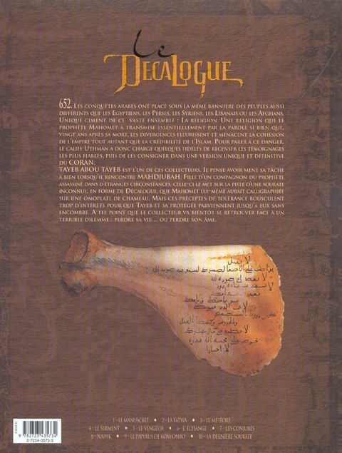 Médine, 652. Tayeb doit recenser les versets « orthodoxes » du Coran. Il entend parler d'une sourate non répertoriée, soi-disant la dernière transmise par Dieu à son Prophète. Rédigée sous forme de Décalogue, elle prône la paix et la tolérance. Mahomet l'aurait écrite lui-même sur une omoplate de chameau. Tayeb doit retrouver cette omoplate à tout prix, mais il ignore encore que son exhumation va déclencher un cataclysme... Voici le dixième et dernier volume de cette série culte ! Il existe plusieurs réimpressions avec le même isbn. L'EO est celle avec AI de janvier 2003
