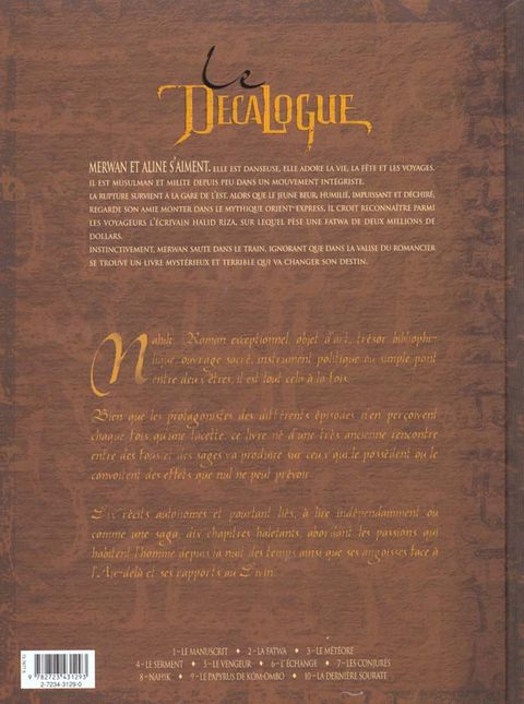 Un livre aussi envoûtant que mystérieux qui porte le nom de « Nahik » contiendrait les dernières volontés du prophète Mahomet. Cet ouvrage serait susceptible de bouleverser entièrement les fondements de notre civilisation. C'est le destin de ce livre dangereux que vous invitent à suivre les auteurs du Décalogue Il existe plusieurs réimpressions avec même isbn/ean et des dos différents.