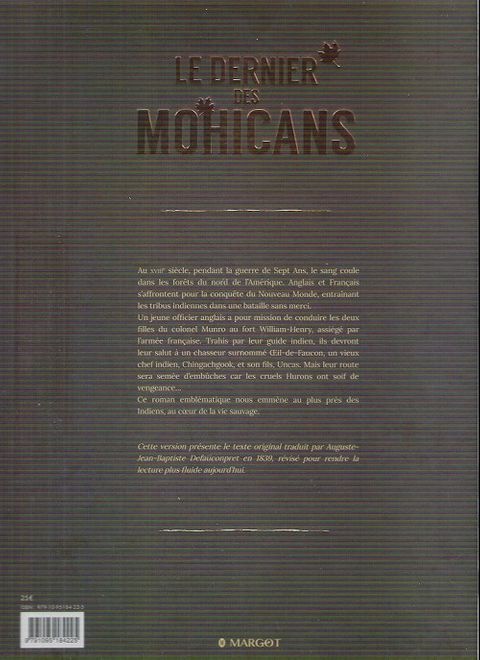 Le Dernier des Mohicans est un ouvrage de référence pour les amateurs de ce pan de l'histoire américaine - la lutte entre Français et Anglais au XVIIIe siècle pour la possession des territoires de l'Amérique du Nord. Ce roman, qui a marqué l'esprit de Patrick Prugne dès l'enfance, a une résonance particulière pour lui. Depuis plusieurs années il avait en tête de l'illustrer. Lorsque nous en avons parlé, cela nous est apparu comme une évidence. En effet, qui mieux que lui pourrait rendre l'atmosphère des grandes contrées sauvages de l'Amérique du Nord ? Son travail est reconnu et apprécié et ses aquarelles, d'une grande beauté, font voyager le lecteur dans des terres lointaines. De plus, il n'existe pas d'édition illustrée récente de ce roman. Environ vingt illustrations en couleurs ainsi que soixante dessins en couleurs et en noir et blanc trouveront leur place dans l'ouvrage, lequel reprendra le texte original de James Fenimore Cooper dans une version abrégée, réalisée par une auteure (Vanina Noël) spécialement pour cette édition. Celle-ci ne trahit nullement l'oeuvre originale ; il s'agissait principalement de remettre le texte «au goût du jour». Il est important de rappeler que le roman original a été écrit pour des parutions mensuelles, au début du XIXe siècle. Toutes les séquences ont par la suite été rassemblées pour créer le roman intégral. Celui-ci souffrait de ce fait de longueurs et d'un manque de dynamisme, qui, plus encore de nos jours, rendaient sa lecture difficile et laborieuse. L'album bénéficiera d'un grand format, identique aux dernières BD de Patrick Prugne, d'une forte pagination - 178 pages -, et les finitions de l'ouvrage seront particulièrement soignées (dos toilé et dorure, beau papier, etc.)