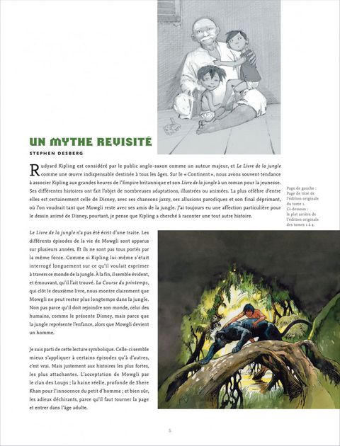 Admirateur émerveillé du «Livre de la Jungle», Stephen Desberg a toujours rêvé de comprendre pourquoi l'humanité a grandi trop vite. Et si Mowgli connaissait la réponse ? Entre-temps, le petit d'homme est devenu grand-père. Desberg l'a retrouvé sur un quai de gare, en partance pour l'Inde, la tête pleine d'attendrissantes visions initiatiques. Le vieux Mowgli médite sur la forêt de son enfance qu'il croyait inviolable et que la modernité a écorché. Le peuple libre des loups a disparu depuis longtemps, mais son âme ne l'a pas oublié.