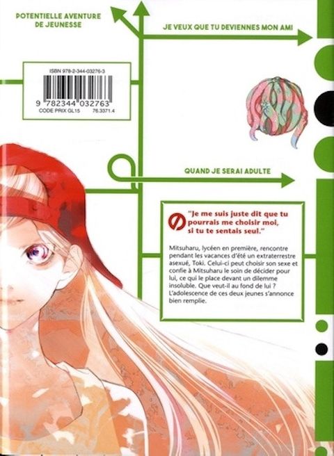 Homme et/ou femme ? Amour et/ou amitié ?Mitsuharu le lycéen rencontre Toki l'extraterrestre, venu sur Terre pour un but bien précis : réunir les ingrédients nécessaires pour déterminer son sexe ! Voyant Mitsuharu seul et incapable de tisser des liens avec son entourage, Toki lui propose de choisir son sexe pour pouvoir lui offrir son amitié ou son amour. Mais à mesure que leurs relations s'approfondissent, le choix devient de plus en plus difficile tout autant pour Mitsuharu que pour Toki...Premier oeuvre du jeune auteur Kiri Gunchi, cette fable fantastique mais réaliste nous interroge sur les choix qui s'offrent à tout adolescent. Un shônen très original et plein de fraîcheur, complet en trois tomes.