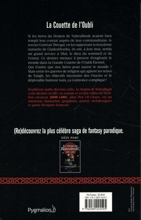(Re)découvrez la plus célèbre saga de fantasy parodique ! Si les héros du Donjon de Naheulbeuk avaient bien rempli leur contrat auprès de leur commanditaire, le sorcier Gontran Théogal, en lui rapportant la douzième statuette de Gladeulfeurha, ils ont, à leur insu, rendu un grand service à Dlul, le dieu du sommeil et de l'ennui. Ce dernier menace à présent d'engloutir le monde dans la Grande Couette de l'Oubli Eternel. Qui d'autre que nos héros pour sauver le monde ? Mais entre les guerres de religion qui agitent les terres de Fangh, les objectifs incertains des Oracles et le déplorable humour nain, ça s'annonce compliqué ! Feuilleton audio devenu culte, Le Donjon de Naheulbeuk a été décliné en BD, en roman et en jeu vidéo en 2020.