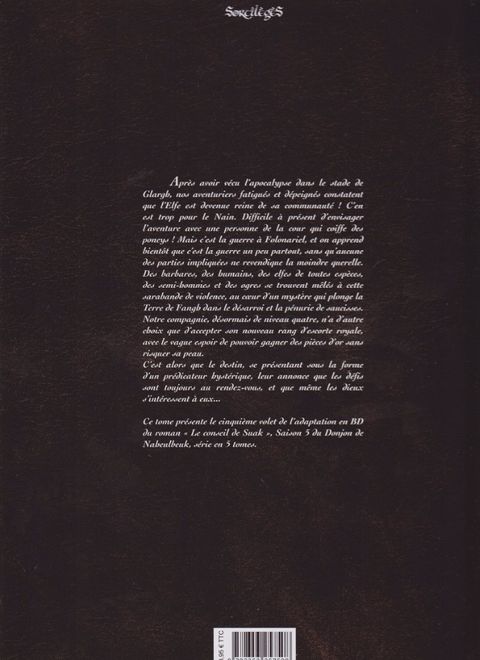 Après avoir vécu l'apocalypse dans le stade de Glargh, nos aventuriers fatigués et dépeignés constatent que l'Elfe est devenue reine de sa communauté ! C'en est trop pour le Nain. Difficile à présent d'envisager l'aventure avec une personne de la cour qui coiffe des poneys ! Mais c'est la guerre à Folonariel, et on apprend bientôt que c'est la guerre un peu partout, sans qu'aucune des parties impliquées ne revendique la moindre querelle. Des barbares, des humains, des elfes de toutes espèces, des semi-hommes et des ogres se trouvent mêlés à cette sarabande de violence, au coeur d'un mystère qui plonge la Terre de Fangh dans le désarroi et la pénurie de saucisses. Notre compagnie, désormais de niveau quatre, n'a d'autre choix que d'accepter son nouveau rang d'escorte royale, avec le vague espoir de pouvoir gagner de pièces d'or sans risquer sa peau. C'est alors que le destin, se présentant sous la forme d'un prédicateur hystérique, leur annonce que les défis sont toujours au rendez-vous, et que même les dieux s'intéressent à eux.