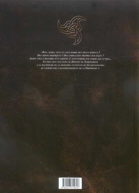 " Bon, alors, vous en avez marre des trucs sérieux ? Des héros héroïques ? Des compagnies propres surelles ? Alors voici l'histoire d'un groupe d'aventuriers pas comme les autres... Entrez avec eux dans le Donjon de Naheulbeuk à la recherche de la dernière statuette de Gladeulfeurha qui permettra l'accomplissement de la prophétie ! " \0