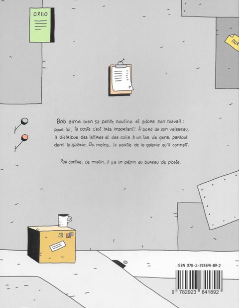Bob aime bien sa petite routine et adore son travail: pour lui, la poste, c'est très important! À bord de son vaisseau, il distribue des lettres et des colis à un tas de gens, partout dans la galaxie. Du moins, la partie de la galaxie qu'il connait. Par contre, ce matin, il y a un pépin au bureau de poste.