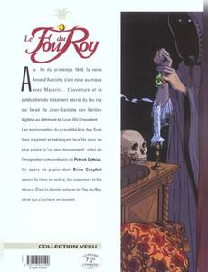 A la fin du printemps 1644, la cour sait que la reine Anne d'Autriche s'est mise au mieux avec Mazarin... Depuis un an déjà, elle a dû renoncer à nuire au Poquelin par crainte des représailles... L'ouverture et la publication du testament secret du feu roy qui ferait de Jean-Baptiste son héritier légitime au détriment de Louis XIV... Avant de trépasser, Louis XIII a rédigé ses dernières volontés en sept exemplaires... Chacun d'eux dûment cacheté a été confié à un homme de sûreté, et la reine a quelques raisons de supposer que le cardinal est un des récipiendaires... Les marionnettes du grand théâtre des Sept Vies s'agitent et mélangent leur fils pour ne plus suivre qu'un seul mouvement : celui de l'imagination extraordinaire de Patrick Cothias. Un opéra de papier dont Brice Goepfert assure la mise en scène, les costumes et les décors avec beaucoup de talent. C'est le dernier volume du Fou du Roy, série qui s'achève en beauté en attendant la conclusion finale du cycle des 7 vies qui arrivera bientôt. La fin d'une des entreprises narratives les plus ambitieuses de la bande dessinée.