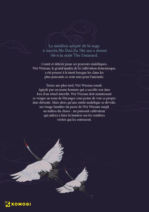 Le manhua adapté de la saga à succès Mo Dao Zu Shi qui a donné vie à la série The Untamed. Craint et détesté pour ses pouvoirs maléfiques, Wei Wuxian, le grand maître de la cultivation démoniaque, a été poussé à la mort lorsque les clans les plus puissants se sont unis pour l'anéantir. Treize ans plus tard, Wei Wuxian renaît. Appelé par un jeune homme qui a sacrifié son âme lors d'un rituel interdit, Wei Wuxian doit maintenant se venger au nom de l'étranger sous peine de voir sa propre âme détruite. Mais alors qu'une entité maléfique se dévoile, un visage familier du passé de Wei Wuxian surgît au milieu du chaos - un puissant cultivateur qui aidera à faire la lumière sur les sombres vérités qui les entourent.