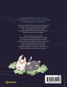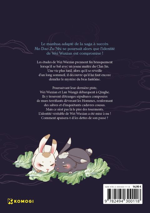Le manhua adapté de la saga à succès Mo Dao Zu Shi se poursuit alors que l'identité de Wei Wuxian est compromise ! Les études de Wei Wuxian prennent fin brusquement lorsqu'il se bat avec un jeune maître du Clan Jin. Une vie plus tard, alors qu'il se réveille d'un long sommeil, il découvre qu'il lui faut encore démêler le mystère du bras fantôme. Poursuivant leur dernière piste, Wei Wuxian et Lan Wangji débarquent à Qinghe. Ils y trouvent d'étranges sépultures composées de murs terrifiants dévorant les Hommes, renfermant des sabres et d'inquiétants cadavres cousus. Mais ce n'est pas là le pire des tourments. L'identité véritable de Wei Wuxian a été mise à nu ! Comment apaisera-t-il les dettes de son passé ?