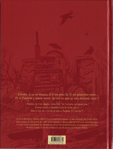 Un monde pour en sauver un autre ?Pour échapper à leurs agresseurs, Pauline et Gaëlle n'ont eu d'autre choix que de se réfugier dans le Petit Monde à l'aide des larmes d'abeille. Dans cet endroit où le temps s'écoule plus lentement, elles font la rencontre de Sombre, le fils qu'Erwan a eu avec la prêtresse hermaphrodite. Alors que Gaëlle se prend d'affection pour le petit, elle le ramène accidentellement avec elle dans le vrai monde. Ici, plusieurs semaines ont passé et les tensions entre Erwan et Blanche sont plus que palpables alors que la catastrophe s'est répandue, que les épidémies se succèdent et que l'humanité, réduite à ses plus bas instincts, semble ne plus en avoir pour longtemps. Se retrouvant sur le même plan d'existence, Blanche et Sombre vont enfin pouvoir se retrouver... Mais quelles seront les conséquences ?Avec ce huitième volume, découvrez la conclusion épique et tant attendue du Grand Mort, série unique en son genre qui mêle avec une virtuosité rare le fantastique au récit post-apocalyptique. Un récit aussi mystérieux qu'ambitieux, miroir des problématiques écologiques et sociales de notre temps, et rendu somptueux par la plume de Vincent Mallié et la palette de François Lapierre.