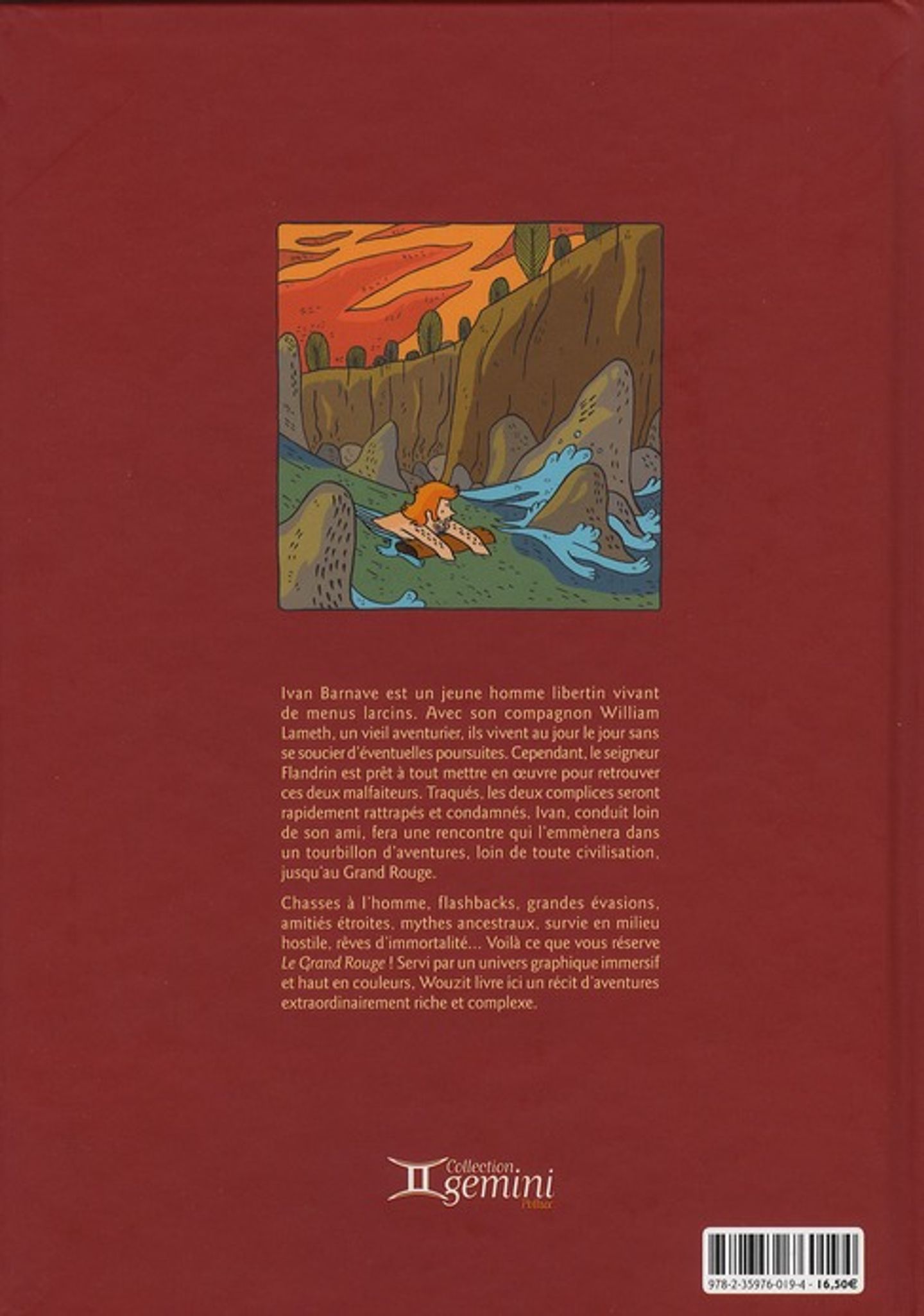 Ivan Barnave est un jeune homme libertin vivant de menus larcins. Avec son compagnon William Lameth, un vieil aventurier, ils vivent au jour le jour sans se soucier d'éventuelles poursuites. Cependant le seigneur Flandrin, pour qui un denier est un denier, est prêt à tout mettre en oeuvre pour retrouver ces deux malfaiteurs.Traqués, les deux complices seront rapidement rattrapés et condamnés. Ivan, conduit loin de son ami, fera une rencontre qui l'emmènera dans un tourbillon d'aventures, loin de toute civilisation, jusqu'au Grand Rouge. Chasses à l'homme, fl ashbacks, grandes évasions, amitiés étroites, mythes ancestraux, survie en milieu hostile, rêves d'immortalité. Voilà ce que vous réserve Le Grand Rouge ! Servi par un univers graphique immersif et haut en couleurs, Wouzit livre ici un récit d'aventure extraordinairement riche et complexe.