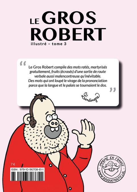 Adepte du détournement et de la parodie, Rouquemoute publie le tome 3 du <em>Gros Robert</em> (Lindingre), un répertoire alphabétique des mots les plus martyrisés de la langue française qui ont loupé le virage de la prononciation parce que la langue et le palais se tournaient le dos. Ce livre de comptoir illustré compile plus de 400 références d’un <em>“bon français dans son excellence”</em> avec des mots tels que antiviol, coucouning, glougueule ou encore macavélique. Également disponible, un coffret réunit les trois tomes du Gros Robert. Dessinateur et scénariste, Lindingre participe aux revues <em>Ferraille</em>, <em>Spirou</em>, <em>Siné Mensuel</em>, <em>L’écho des Savanes</em> ou encore <em>Fluide Glacial</em> dont il a été le rédacteur en chef de 2012 à 2018. Depuis 2015, il écrit des sketchs pour <em>Groland</em>. Il dessine également à <em>L’Est Républicain</em> et au <em>Canard Enchaîné</em>. Il est le créateur du personnage Titine et de la série <em>Chez Francisque</em> avec Manu Larcenet ou Jeff Pourquié au dessin, pour laquelle il a obtenu le prix Schlingo en 2009 au Off of Off du Festival international de la bande dessinée d’Angoulême. Il a scénarisé des albums pour de nombreux dessinateurs : Ju/Cdm, Chauzy, Lefred Thouron, Planchon, Aurel ou encore Laurent Astier.