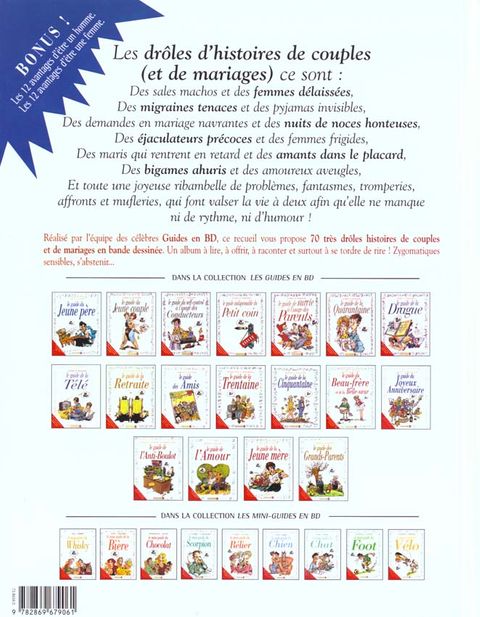 Ah ! Les blagues ! On en raconte depuis qu'on est gamin dans les cours d'écoles. On les écoute ensuite au comptoir du bistrot, avec ses collègues. Lors des sempiternels repas de famille, chacun essaie de sortir son meilleur cru.Les Guides en BD ont donc eu la riche idée de transposer en bande dessinée une sélection des meilleurs histoires drôles de notre patrimoine (et Dieu sait s'il en est riche), des plus célèbres aux petites perles cachées. Leur point commun, c'est qu'elles abordent toutes des histoires de couples, et qu'elles nous parlent avec un humour croustillant des rapports entre hommes et femmes.