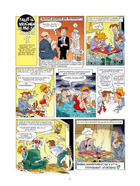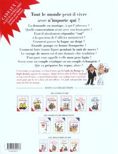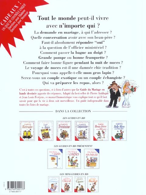 Tout le monde peut-il vivre avec n'importe qui ? la demande en mariage à qui l'adresser ? quelle conversation avoir avec son beau-père ? faut-il absolument répondre " oui " à la question de l'officier ministériel ? comment passer la bague au doigt ? grande pompe ou bonne franquette ? comment faire bonne figure pendant la nuit de noces ? le voyage de noces est-il une damnée chic tradition ? pourquoi vous appelle-t-elle mon gros lapin ? serez-vous un couple exotique ou un couple échangiste ? qui va préparer les repas, alors ? c'est à toutes ces questions, et à bien d'autres que le guide du mariage en bande dessinée apporte des réponses. Adapté du best-seller de pierre antilogus et jean-louis festjens, ce manuel humoristique vous explique tout ce qu'il faut savoir pour que la vie à deux soit merveilleuse. un guide indispensable dans toutes les listes de mariage.