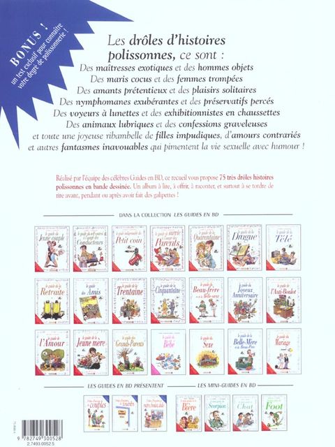 On raconte des blagues depuis qu'on est gamin dans les cours d'écoles. On les écoute ensuite au comptoir du bistrot avec ses collègues. Lors des sempiternels repas de famille, chacun essaie de sortir son meilleur cru. Et celles que l'on préfère, même si l'on n'ose pas toujours l'avouer, ce sont les histoires polissonnes... les blagues de cul, pour parler plus franchement."Les Guides en BD" ont donc eu la riche idée de transposer en bande dessinée une sélection des meilleurs histoires drôles de notre patrimoine, des plus célèbres aux petites perles cachées. Leur point commun, c'est qu'elles abordent toutes des histoires coquines, qu'elles ont toutes un rapport plus ou moins direct avec l'amant caché dans le placard...Plusieurs auteurs se sont associés pour vous raconter des blagues plus délirantes les unes que les autres et savamment mises en images. Les blagues, une fois qu'on les a lues en bande dessinée, on ne les oublie plus. "Drôles d'Histoires Polissonnes", ouvrage rassemblant le meilleur cru des galéjades « interdites », est franchement hilarant. Il vous permettra de rire et de faire rire aux larmes pendant vos soirées entre amis et vos dîners en famille.