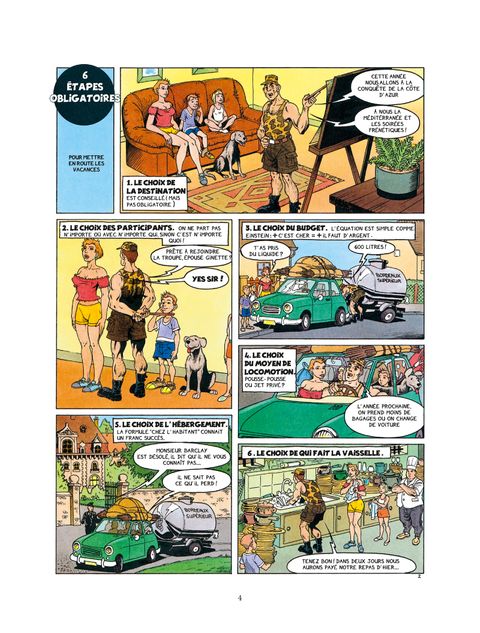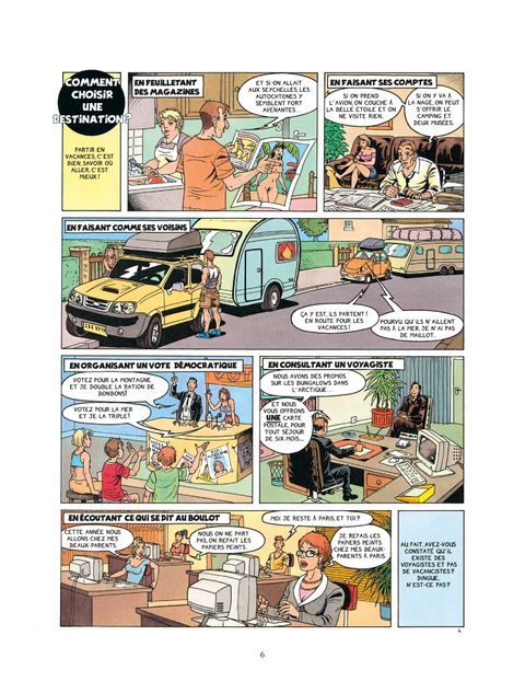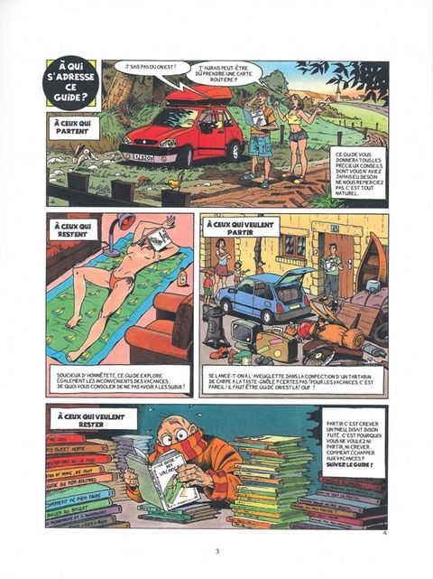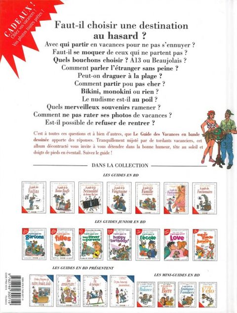 Faut-il choisir une destination au hasard ? Avec qui partir en vacances pour ne pas s'ennuyer faut-il se moquer de ceux qui ne partent pas quels bouchons choisir ? a13 ou beaujolais ? Comment parler l'étranger sans peine ? peut-on draguer à la plage ? comment partir pour pas cher bikini, monokini ou rien le nudisme est-il au poil ? quels merveilleux souvenirs ramener comment ne pas rater ses photos de vacances ? est-il possible de refuser de rentrer ? C'est à toutes ces questions, et à bien d'autres, que le guide des vacances en bande dessinée apporte des réponses. Tranquillement mijoté par de tordants vacanciers, cet album décontracté vous invite à vous détendre dans la bonne humeur, tête au soleil et doigts de pieds en éventail. suivez le guide !
