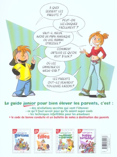 Les parents ne s'élèvent pas tout seuls, les Guides Junior l'ont compris. Après deux albums consacrés respectivement aux filles et aux garçons, ce nouveau guide explique aux juniors comment bien élever les parents. Humour et dérision garantis ! Eh oui, car les parents ne sont pas faciles à éduquer. Ils sont inquiets, fragiles, et même s'ils sont animés de bonnes intentions, ils sont vite dépassés par leurs bons sentiments. Que faire face à maman qui veut vous forcer à manger des haricots verts ? Comment gérer papa qui croit toujours avoir raison ? Faut-il recourir à l'autorité et de quelle façon ? Autant de questions, de conseils et d'astuces pour aider les juniors dans leur délicate mission. Un guide à mettre entre toutes les mains, enfants et parents, tous se délecteront des situations comiques de la vie familiale. Les juniors le réclamaient et Vents d'Ouest l'a fait ! Il manquait à la palette des Guides en BD une collection dédiée aux plus jeunes, c'est à présent chose faite avec ces Guides Junior ! Des Guides à offrir à tous les enfants, et à tous ceux qui ont été enfants un jour même s'il y a longtemps ! Cette collection d'humour rencontre un énorme succès ! Les titres se sont en effet déjà vendus à plus de 3.000.000 d'exemplaires. À chaque événement de la vie correspond une bande dessinée pleine d'humour et d'imagination. Des livres tout public qui font d'excellentes idées de cadeaux.