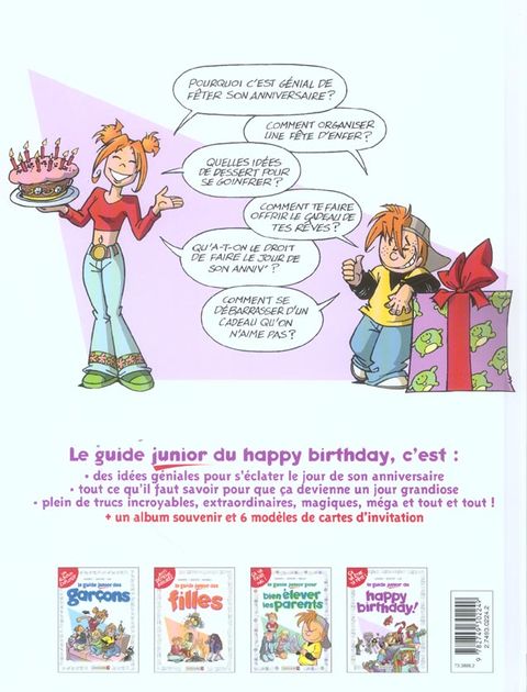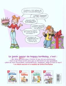 Invariablement, tous les ans, surgit au détour du calendrier une date fatidique pour les enfants : celle de leur anniversaire ! Et un tel jour, propice à toutes les fêtes, il ne faut surtout pas le gâcher. Sinon, on est quitte pour attendre avec impatience un an de plus. heureusement pour vous, Ninou et Mino sont là pour vous prendre en main. C'est avec un humour décapant que ce guide répond aux questions incontournables que se posent tous ceux qui veulent une super-méga-fête d'anniversaire. Car, on croit que c'est facile de tout organiser. Eh bien, détrompez-vous ! Tenez, connaissez-vous l'art d'ouvrir les cadeaux ? Ou quel est le meilleur moment pour les recevoir ? Ah, vous voyez : vous hésitez. Heureusement, Ce guide spécialement conçu pour les juniors n'attend plus que vous ! C'est le cadeau idéal à offrir à tous les gamins qui fêtent leur anniversaire ! Happy Birthday ! Les juniors le réclamaient et Vents d'Ouest l'a fait ! Il manquait à la palette des Guides en BD une collection dédiée aux plus jeunes, c'est à présent chose faîte avec ces Guides junior ! Des guides à offrir à tout les enfants et à tous ceux qui ont été enfants un jour même s'il y a longtemps ! Cette collection d'humour rencontre un énorme succès ! Les titres se sont en effet déjà vendus à plus de 3.000.000 d'exemplaires. A chaque événement de la vie correspond une bande dessinée pleine d'humour et d'imagination. Des livres tout public qui font d'excellentes idées de cadeaux.