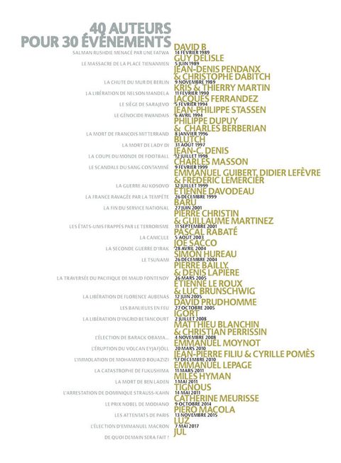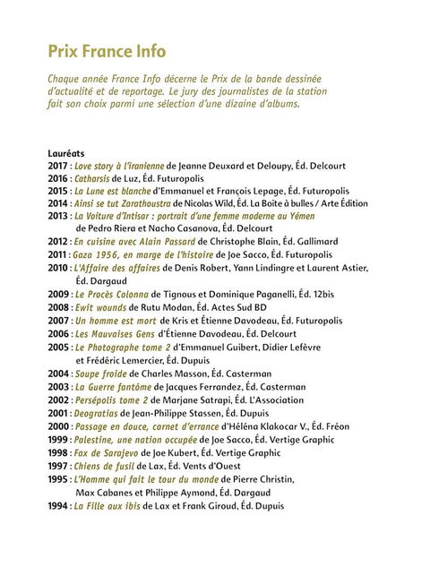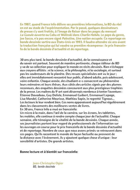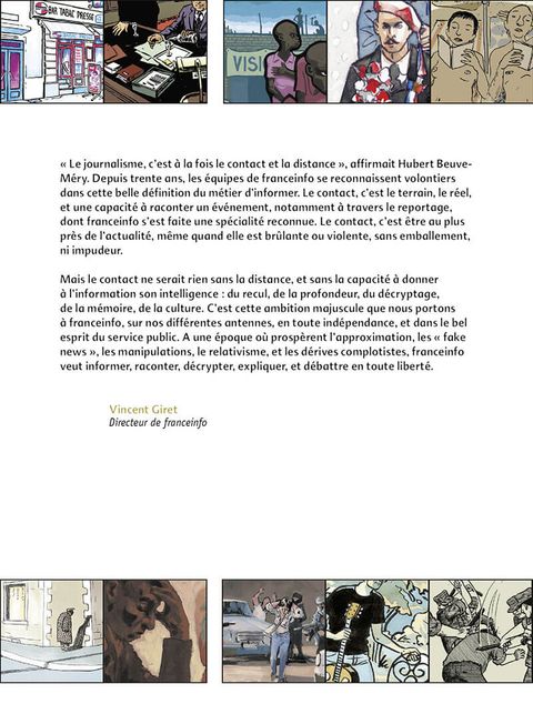 Les liens entre France Info et la bande dessinée sont forts, notamment grâce aux chroniques hebdomadaires de Jean-Christophe Ogier et au Prix France Info de la bande dessinée d'actualité et de reportage décerné à une BD d'actualité (et ce bien avant que cela ne soit devenu un genre à la mode). Tout naturellement, on retrouvera dans ce livre d'anciens lauréats du Prix (Joe Sacco, Jean-Philippe Stassen, Etienne Davodeau, Jacques Ferrandez, Pierre Christin, et Luz...), des auteurs Futuropolis (Pascal Rabaté, Jean-Claude Denis, Blutch, David B, Baru, Igort...) et des invités de marq ue (Guy Delisle, Tignous, Jul...).