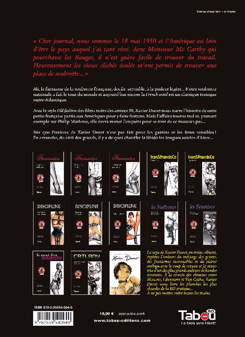 « Cher journal, nous sommes le 18 mai 1950 et l'Améri que est loin d'être le pays auquel j'ai tant rêvé. Avec Monsieur Mc Cathy qui pourchasse les Rouges, il n'est guère facile de trouver du travail. Heureusement les vieux clichés éculés m'ont permis de trouver une place de soubrette. » Ah, le fantasme de la soubrette française, docile, serviable, à la pudeur légère. Notre soubrette nationale à fait le tour du monde et aujourd'hui encore la French maid est un classique érotique outre-Atlantique. Avec le style old fashion de la BD noire des années 50, Xavier Duvet nous narre l'histoire de cette petite française partie aux Amériques pour y faire fortune. Mais l'affaire tourne mal et, prenant exemple sur Philip Marlowe, elle devra mener l'enquête pour se tirer de ce mauvais pas. Nouvelle édition pour cette bande dessinée culte qui est à l'origine (et aussi le best-seller !) de la Saga Duvet !